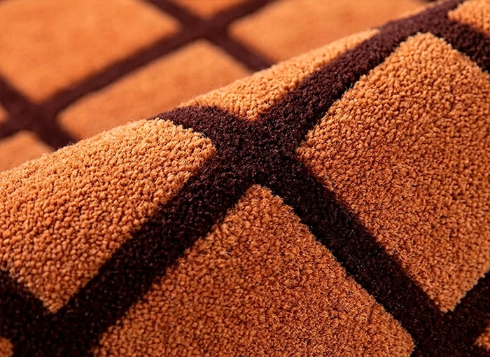 8x10 terracotta and brown wool rug with grid pattern and sculpted tufted texture, perfect for modern living rooms