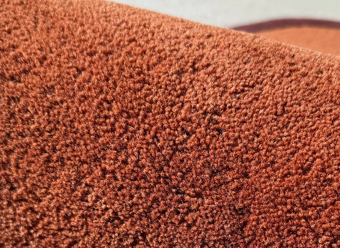 Textured close-up of rust brown wool runner with dark brown border, modern boho entryway rug
